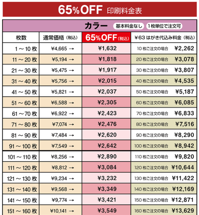 表ですと少しわかりづらいかもしれませんが、たとえば100枚印刷の場合の通常料金が、